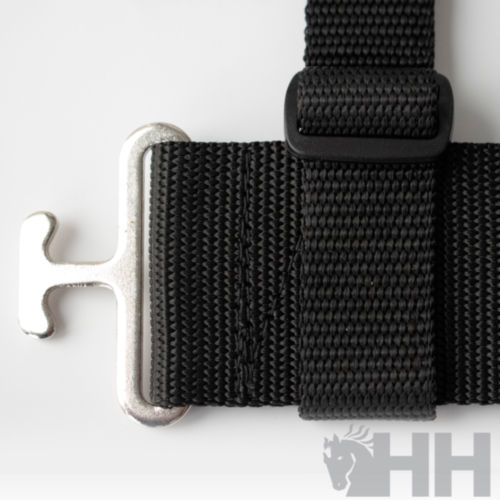 Tira de polipropileno y hebilla de acero con cierre y deslizador. Ajustable de 30 a 50 cm.