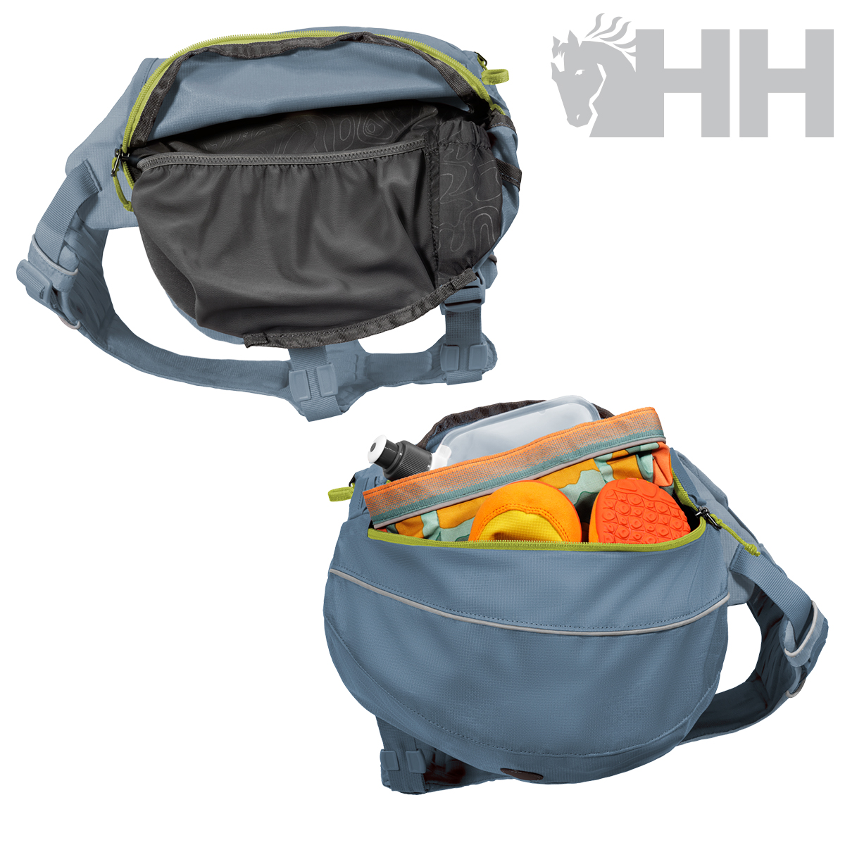 • Transporte estable del equipo: las alforjas con corte radial y peso hacia delante y los «flopper stoppers» mantienen la mochila y su contenido estables contra tu perro.