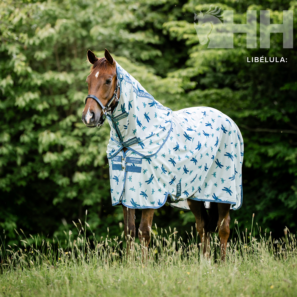 Manta realizada en poliéster ultra transpirable para proteger al caballo de todo tipo de insectos. Incorpora capucha para el cuello y el sistema patentado de diseño en arco para la posición de las manos del caballo y que éste pueda moverse con total libertad. Colores brillantes con propiedades que reflejan el sol, además de una divertida opción de estampado de libélulas.